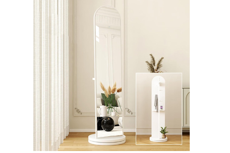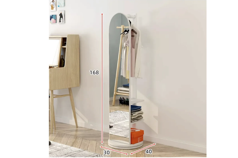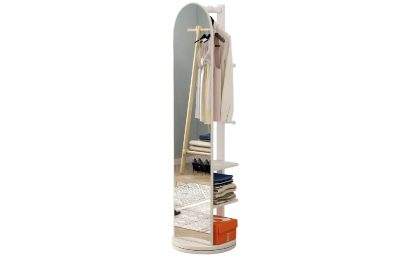 Este espejo giratorio con percha es una solución elegante y funcional para quienes buscan maximizar su espacio sin sacrificar el estilo.