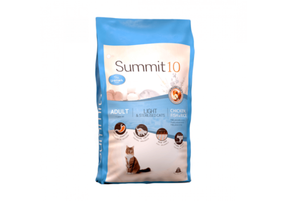• Destinado a controlar el peso del gato adulto, Summit 10 incorpora fibra dietética con efecto saciante y un bajo contenido en grasas.