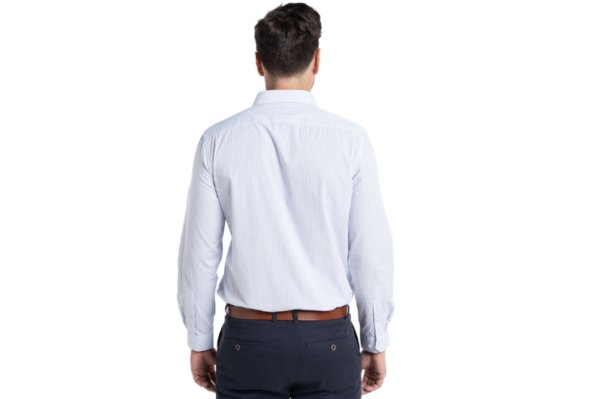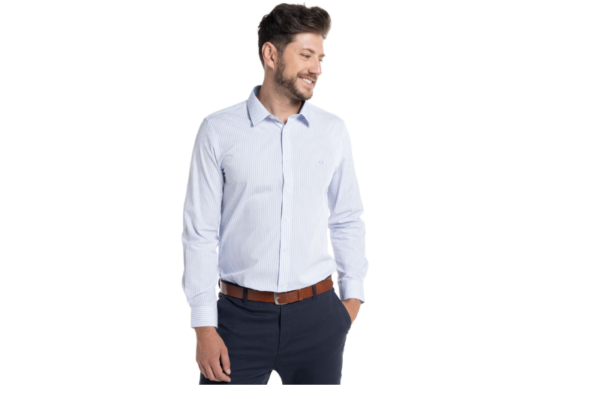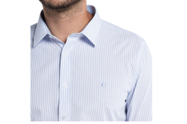 Camisa trevira de rayas con cuello semi italiano clásico, bordado sutil en el pecho y detalles contrastados en el interior del cuello y los puños. perfecta para la oficina, aporta un toque de estilo y elegancia al look profesional.