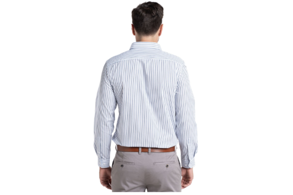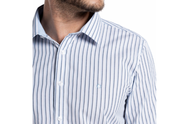 Camisa trevira de rayas con cuello semi italiano clásico, bordado sutil en el pecho y detalles contrastados en el interior del cuello y los puños. perfecta para la oficina, aporta un toque de estilo y elegancia al look profesional.