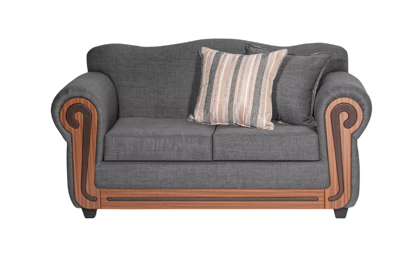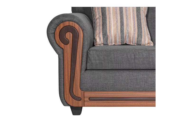 DISEÑO Y ESTILO : Presentan un estilo que combina líneas suaves con un toque clásico debido a los detalles de madera tallada en los reposabrazos y la base .El color gris neutro de la tapicería y los cojines estampados permiten una fácil combinación con diferentes estilos decorativos.